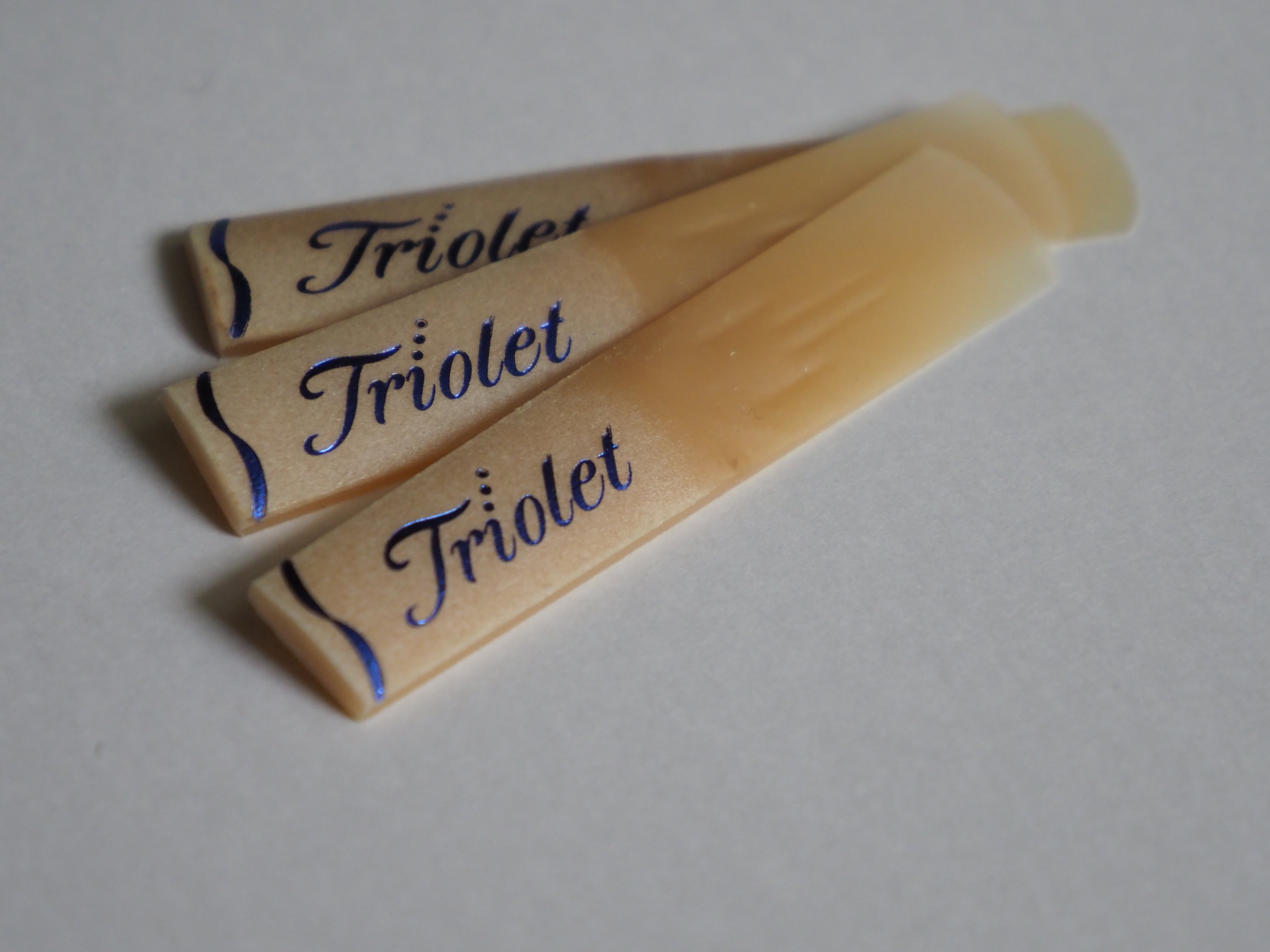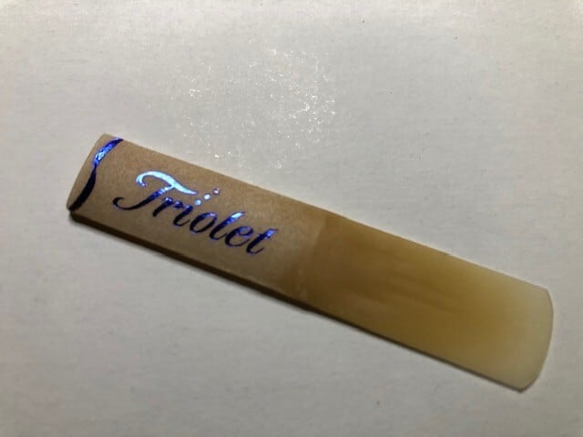 薄茶色の樹脂にブルーメタリックのロゴ印刷されたリード。